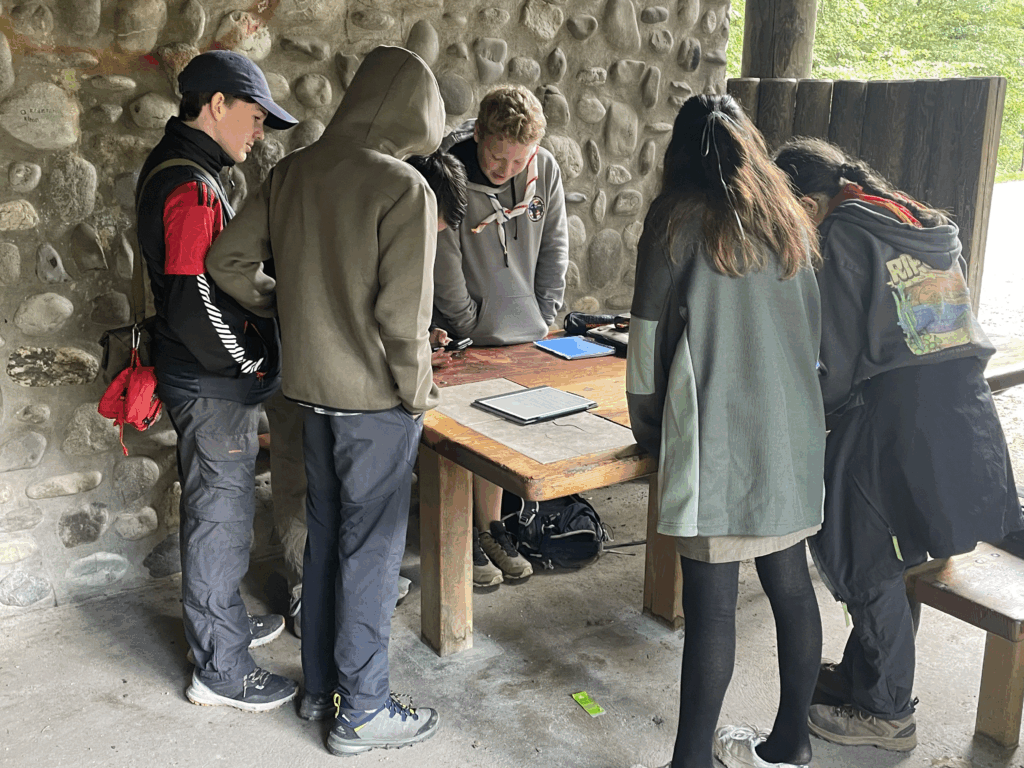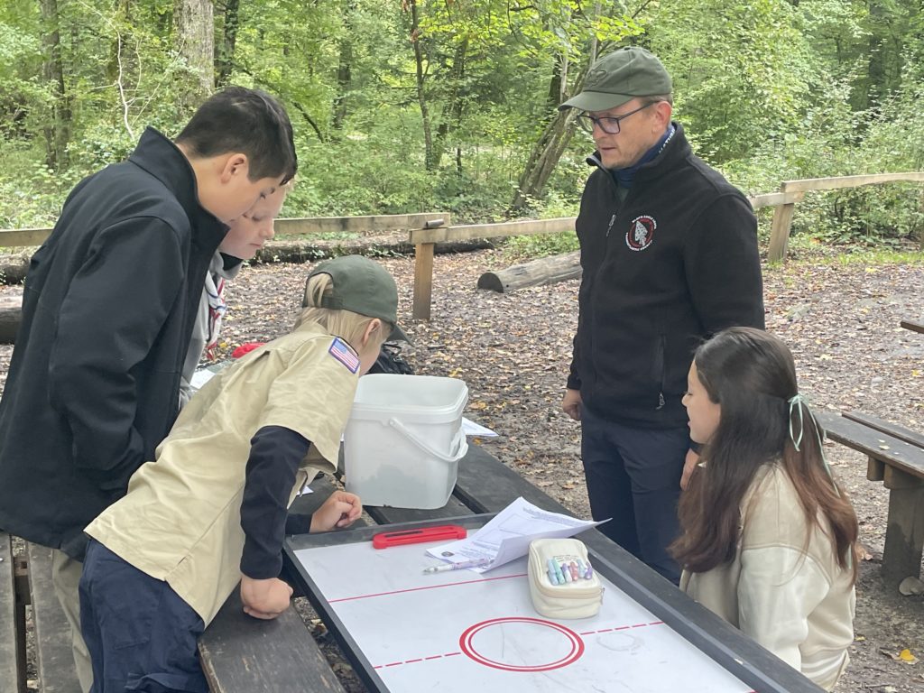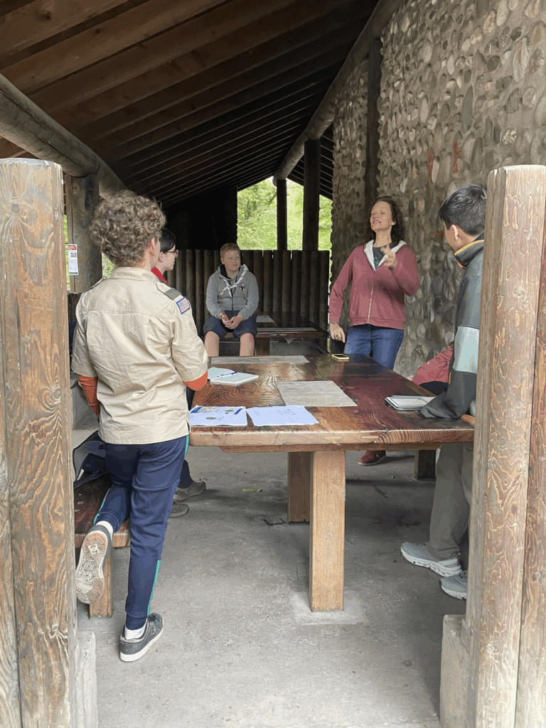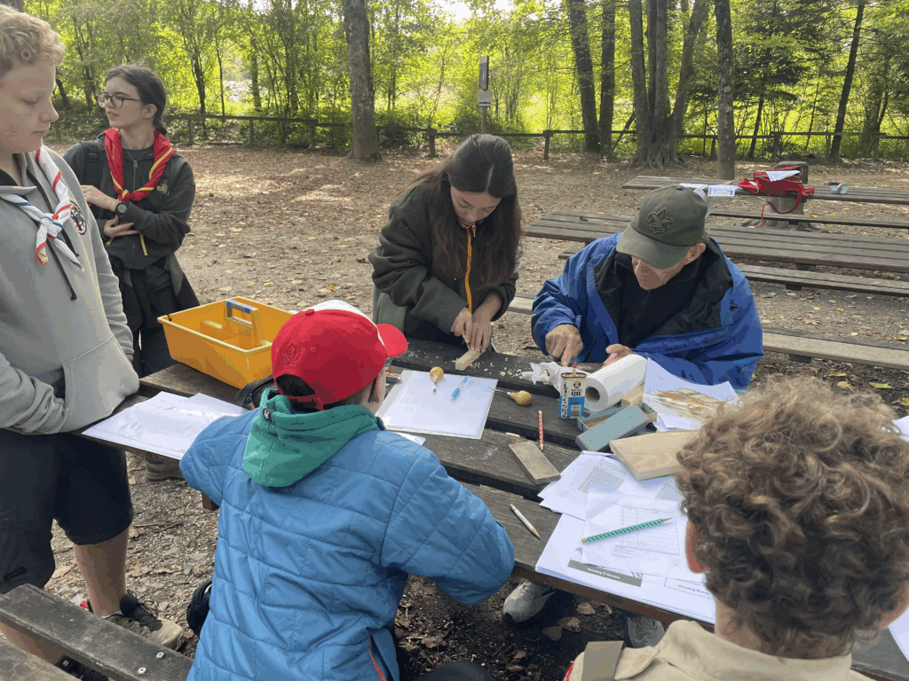Starting at 9:30 AM, March 30, 2025, Scouts met at the Cabane de Bucherons, an outdoor open-air stone and wood cabin located in the woods of Versoix, for a merit badge day. The purpose of such a day is to give Scouts the opportunity to learn the skills and knowledge required to earn merit badges. These badges represent skill sets Scouts may need for advancement or want to learn out of personal interest. This merit badge day, Scouts were given the opportunity to participate in hands-on activities, such as bug finding and wood carving, led by experienced and knowledgeable Scout Leaders.