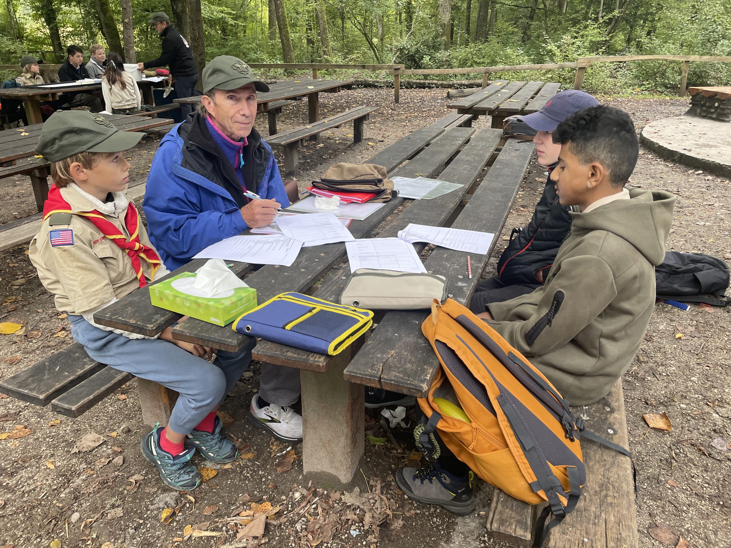 Starting at 9:30 AM, March 30, 2025, Scouts met at the Cabane de Bucherons, an outdoor open-air stone and wood cabin located in the woods of Versoix, for a merit badge day. The purpose of such a day is to give Scouts the opportunity to learn the skills and knowledge required to earn merit badges. These badges represent skill sets Scouts may need for advancement or want to learn out of personal interest. This merit badge day, Scouts were given the opportunity to participate in hands-on activities, such as bug finding and wood carving, led by experienced and knowledgeable Scout Leaders.